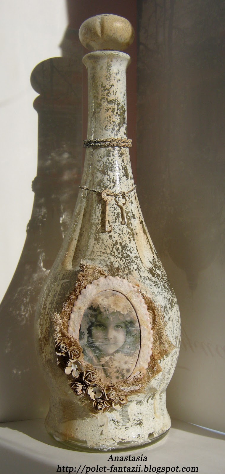 Тут все тоже очень и очень просто. Банка покрашена акрилом, затерта щеткой, измазана чернилками дистресс. Украшена кружевами 2 вида, лента листья, шебби лента, салфеточка, девочка - распечатка, бабочки. Вроде ничего не забыла. )))) Все тканевые элементы (кружево, ленты) прошли подготовку в чае)))